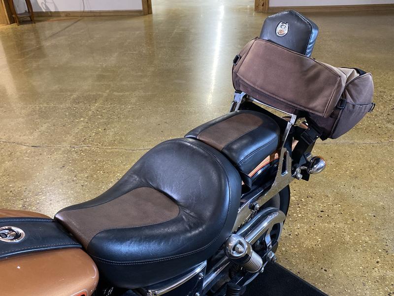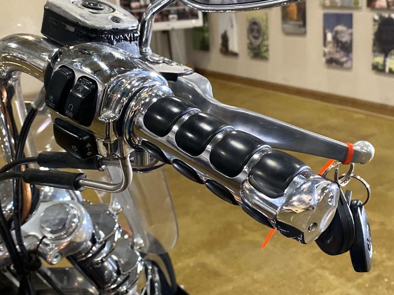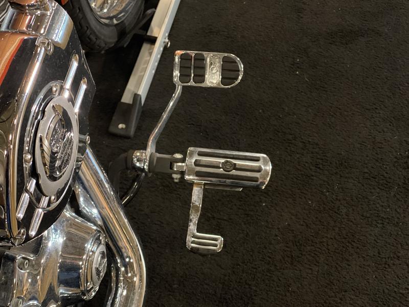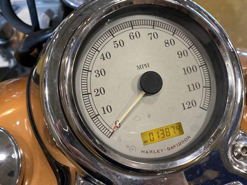 - Wide, raked-out front fork(34°) with 49mm fork tubes; 1-¼” ape-hanger handlebar internally wired (clean front-end look); bobtail fender; stepped, chopper seat; forward-mounted foot controls; 21-in. laced front wheel; large, tank-mounted speedometer; for 2008, presented in serialized, limited-edition 105th Anniversary styling