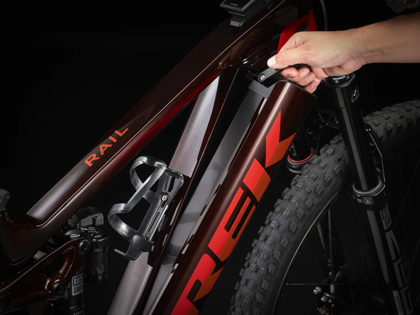 - Trek’s Removable Integrated Battery (RIB) system looks great and is super user-friendly: it fully hides the battery in the frame for protection, makes it easy remove the battery without tools and lets you mount a water bottle cage